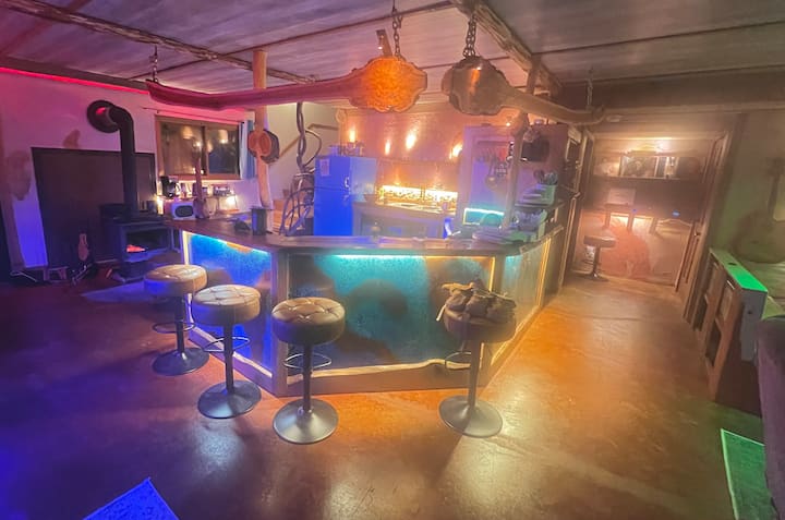 The Interior: Your very own forest boutique hotel experience, all to yourself. Step inside and be enveloped by the drama of multi-colored lighting, roman-inspired plaster walls, and a stunning “hotel lobby bar”. The ambiance strikes the perfect balance between wilderness and luxury, akin to a boutique hotel nestled in a forest.