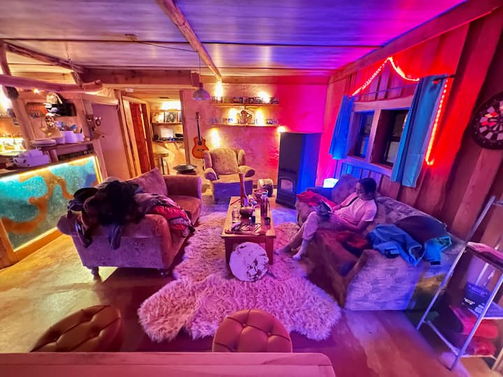 In addition to our serene retreat, we've crafted a unique, creative oasis in our cozy living room, transforming it into a mini PA system soundstage. Turnkey to maximize expression and flow. Instantly ready for jamming. Equipped with wireless mics, electric guitars, vintage piano, a variety of world percussion instruments, and hand drums, it’s always ready for an impromptu session. Gather around for evenings filled with music, storytelling, and shared experiences.
