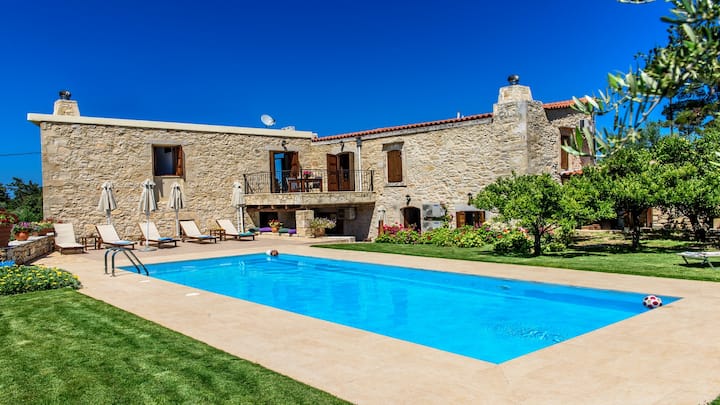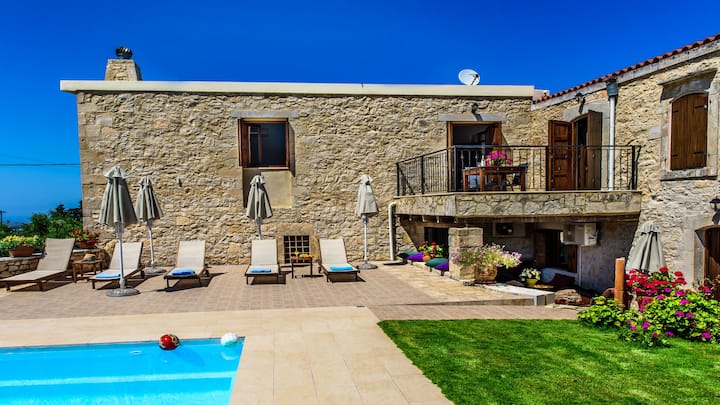 A traditional stone-built Villa with 4 master bedrooms plus 2 small ones and 4 bathrooms built within a beautiful olive grove and a 1000sq.m. plot with 40sq.m pool. The villa is a comfortable 156 sq.m two-story building made of natural material with more than 150years of history.
