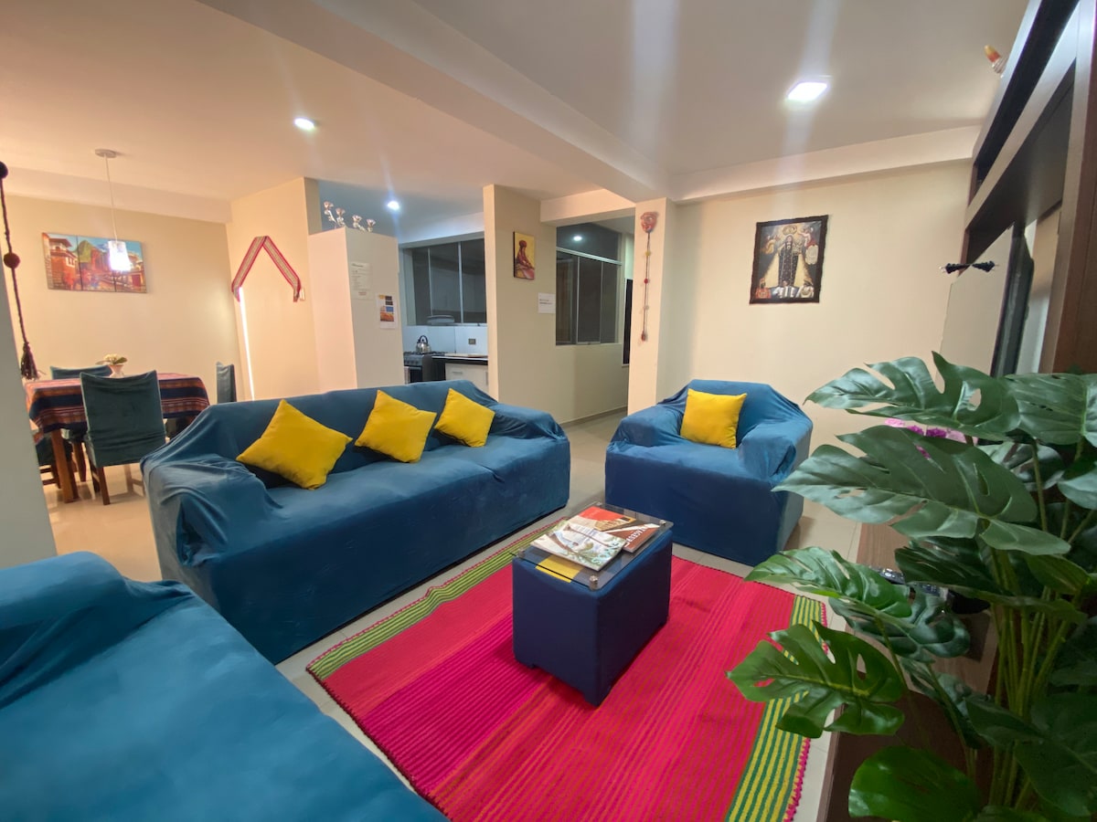 Cozy and spacious apartment in Cusco with panoramic views. Ideal for up to 6 guests, it features 3 bedrooms with TV and heaters (optional), 2 full bathrooms, living room, dining area, fully equipped kitchen, laundry, and WiFi. Hot water 24/7. Located on the 5th floor (no elevator). Parking available. Just minutes from the historic center — perfect to enjoy Cusco in comfort and peace.