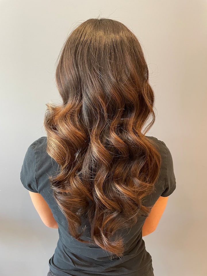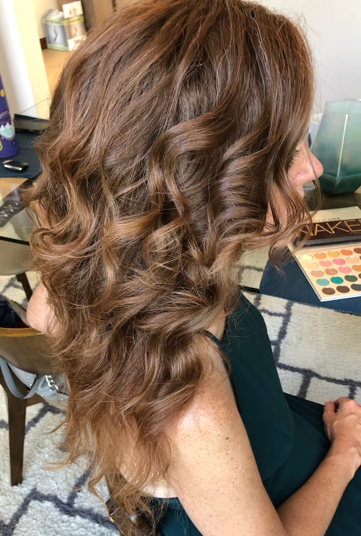 Volumous, exquisite round brush technique using Kenra styling products. Pinned up blow dry for bounce with a shine for a long lasting hold. Curling iron work for texture and loose beachy waves.