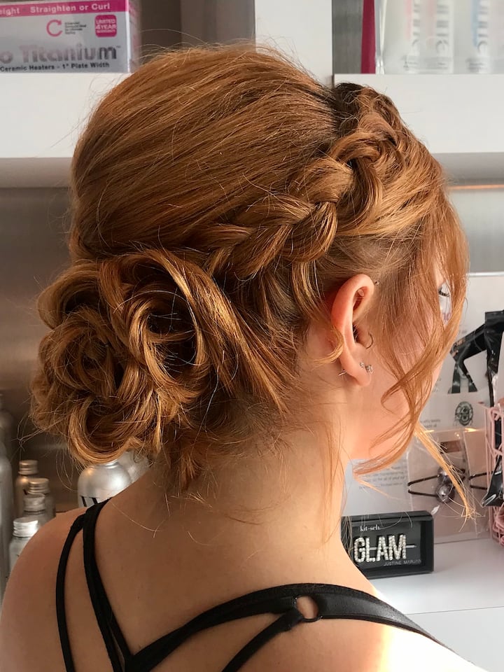 Formal or casual hairstyle where the hair is arranged to have a sleek, polished look or effortlessly romantic. A chignon bun, top knot or tousled loose strands cascading down. Versatility and extensions can add volume, length, texture, but mostly look secured and balanced.
