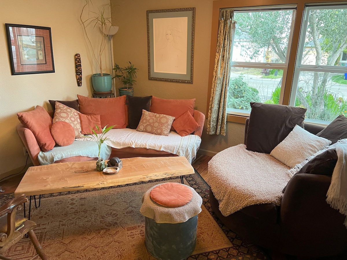Eclectic style with amazing vibes. Yes, this IS a shared housing situation, BUT it's almost like having your own home. I primarily live across town with my husband but love to retreat to the 'Valley House' for gardening, creative time, spa days, tea w/ friends, working in my home office or doing required maintenance. I/we spend a few afternoons & maybe one night a week there. So, occasionally you would share the communal areas with cool locals, but mostly you would have the place to yourself.