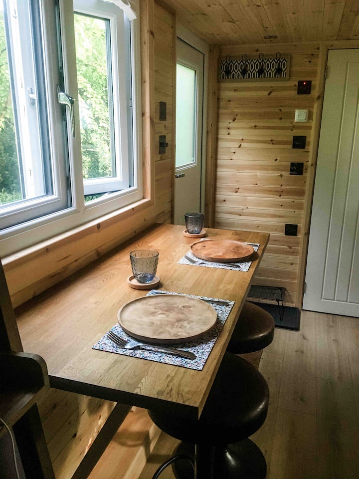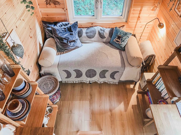 Luna's Lodge benefits from a contemporary kitchen with appliances and an eco friendly bathroom including a shower head that purifies the water and a non flushing compost loo to save water. The living area is beautifully furnished with relaxation as the focus for both body and mind with its mini library. There is a work space (aka the breakfast bar) for those who may need to dip into work during their stay. Under floor heating keeps the feet and the tiny home toastie in winter.