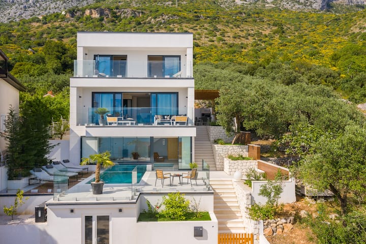 This luxurious, cascading villa is nestled into a verdant landscape, with an oceanfront view overlooking the cerulean sea. The ultra modern interior is detailed with sophisticated touches, such as polished wooden décor and sumptuous sapphire sofas. Your choice of beautiful beaches along the Makarska coast await, with the closest one being just a few short, scenic steps away from your backyard.