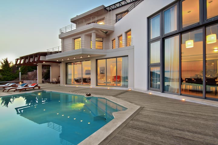 Each bedroom boasts mesmerizing vistas of either the garden greenery or sparkling surf. A glass railing on the balcony ensures an unobstructed field of vision. Dive into the turquoise-tiled all-season pool for an instant cool down, or take a seat on one of the built-in hydromassage loungers, taking your relaxation to the next level. No matter what season you visit, this modern abode has your comfort taken care of—air conditioning in the summer and a floor heating system in the winter. A fully-equipped kitchen offers all the essentials needed to whip up an inky risotto with a fresh octopus salad. Tucked around the side of the house is an alfresco dining option.