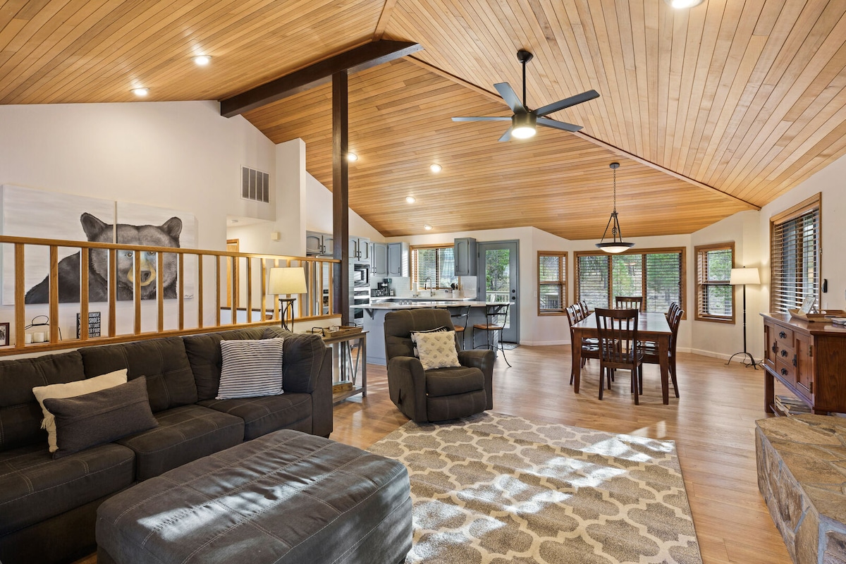 Steps away from the Deschutes River, biking/walking paths & golf course, our luxury Sunriver retreat is in the perfect location! Featuring 3 king master suites, a huge built-in bunkhouse with 6 beds, an additional king bedroom and a queen sleeper sofa - our house sleeps 16! And the amenities are endless... hot tub, A/C, 12 SHARC passes, EV charger, fireplace, chef's kitchen, ping pong table, shuffle board table, old school arcade, bikes, wifi and more!