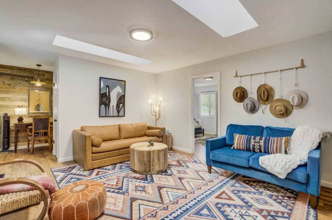 Relax with the whole family in this peaceful two bedroom tiny home. Sleeping up to six people, this tiny home offers a Queen-size bed, a twin, full bed, and a Queen-size pull-out sofa. Enjoy a bathroom with tub and shower and large TV and DVD player for those nights in. The kitchen is fully equipped and all linens are provided.