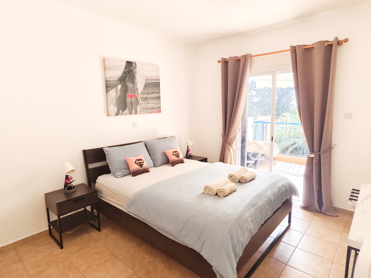 Modern fully equipped, spacious apartment, recently painted, new sofas, new bedding, new sun loungers, upgraded swimming pool and soft furnishings, panoramic views of Coral Bay and mountains. Shared swimming pool, sauna, gym, gardens, on site parking. Sleeps four, large balcony, fully fitted kitchen, bedding/towels supplied. Free Wifi and International TV. No hidden charges. Complies with Cyprus Ministry of Tourism Legislation.